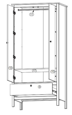 • За распашными дверями шкаф разделен на два отделения: стационарная штанга для одежды и полка;