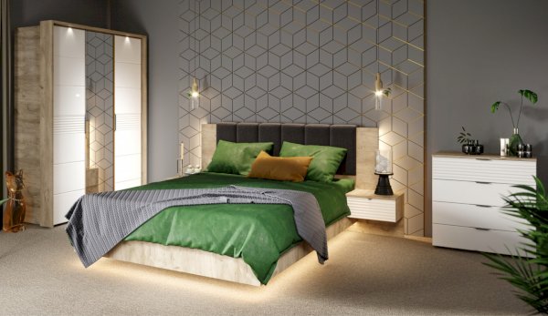 Спальня Джулия – новинка европейского рынка! Белый глянец на фрезерованных фасадах спальни отражает даже малое количество естественного света, делая ее намного уютней и светлей. Корпус из ЛДСП австрийского концерна Кроношпан с декором дуб крафт серый - цвет и текстура натурального дерева. Центральный элемент - двуспальная словно парящая в воздухе кровать, выполненная в простых и лаконичных формах с подсветкой снизу - самый актуальный дизайн современной спальни. Это свежее стилистическое решение, способное удивить родственников, друзей. Светодиодная подсветка служит дополнительным освещением в ночное время и создает романтическое настроение. Комбинированное мягкое изголовье с подсветкой - дополнительный комфорт, на него удобно опираться. Большой вместительный шкаф с точечной подсветкой и рамкой из ЛДСП 22мм. Современные торцевые ручки очень удобны в эксплуатации и надежно крепятся к фасадам.