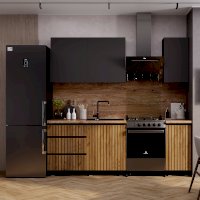 Универсальный дизайн кухни "Шерлок" легко адаптируется под различные интерьерные решения. Фотопечать "рейки" создает иллюзию фактурности. Высокие ножки позволяют без труда поддерживать чистоту на кухне с помощью робота-пылесоса.