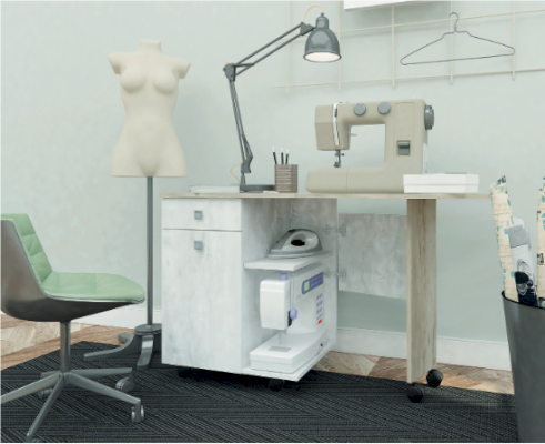 Можно использовать как обычный столик. Есть колесики – поэтому удобно перевозить. Есть ящик и полка со створкой.