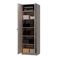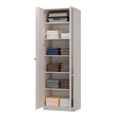 Данный шкаф имеет две распашные створки: на одной наклеены 3 зеркала с фацетом, вторая створка глухая. Данная модель идет в комплекте со штангой. По желанию, Вы можете заменить штангу полками. Полки приобретаются отдельно.