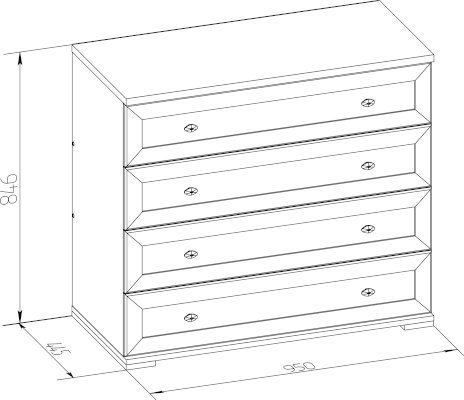 Широкий комод в спальню с четырьмя ящиками на шариковых направляющих позволит рационально использовать площадь комнаты. Ящики глубиной 35 см, высотой 14 см и шириной 89 см выдерживают нагрузку до 20 кг каждый.