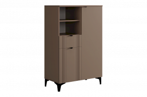 Дизайн комода продуман до мелочей: с одной стороны расположена глухая дверца, за которой скрывается просторное пространство для хранения. С другой стороны – ниша с открытой полкой, выкатной ящик и ещё одна глухая дверца, что позволяет гибко организовать хранение и поддерживать порядок в доме.