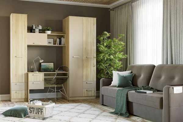 Полка органично дополнит рабочее место в детской. Закрытая секция модуля подойдет для хранения книг. Газлифты максимально высоко поднимают фасад вверх, обеспечивая большую площадь обзора содержимого. Предметы декора будут хорошо смотреться в открытой секции полки.
