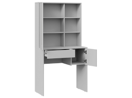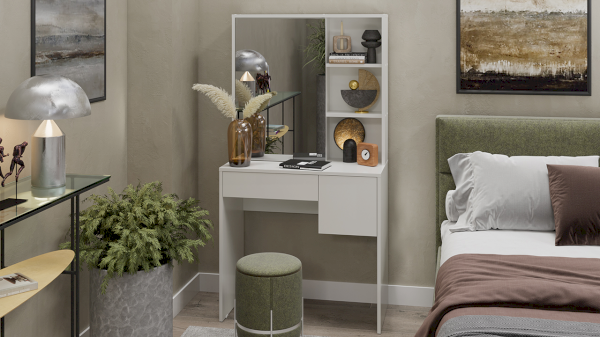 Помимо внешней привлекательности стол имеет большое зеркало, за которым размещены скрытые полки для хранения всех необходимых аксессуаров и косметики. Наличие открытых полок позволит установить предметы декора, а практичный выдвижной ящик и секция за распашной дверцей добавит места для необходимых мелочей. В этом туалетном столике нет ничего лишнего, только самое необходимое для уголка женской красоты.
