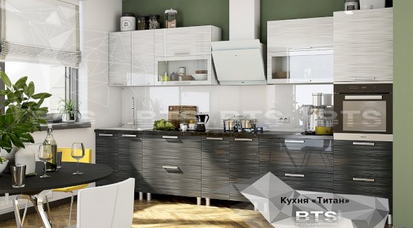 Цветовое сочетание "М28" и "М29" - беспроигрышное сочетание черно-белых глянцевых поверхностей дает ощущение чистоты и свежести. Стильный и всегда актуальный интерьер выгодно преображает кухню, погружая в атмосферу свободы, элегантности и изящества. Глянцевая поверхность фасадов кухни Титан оптически расширяет пространство и придает грациозность интерьеру. Смягченные горизонтальными полосами белый и черный цвета добавляют шика и элегантности. Матовые стекла на фасадах придают особый шарм интерьеру, визуально размывая формы кухонной утвари, скрытой внутри и наполняя красками сдержанный характер кухни Титан.
