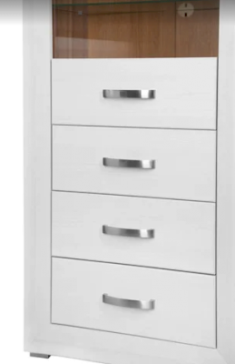 Верхняя часть изделия оснащена стеклянными полками, скрывающимися за распашной застекленной дверью