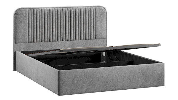 Каркас кровати усилен поперечной и продольной опорами, что гарантирует максимальную устойчивость конструкции. Важной и функциональной деталью также является возможность рационального хранения, поэтому кровать оборудована подъемным механизмом, обеспечивающим верхнюю фиксацию и удобный доступ к месту для хранения.